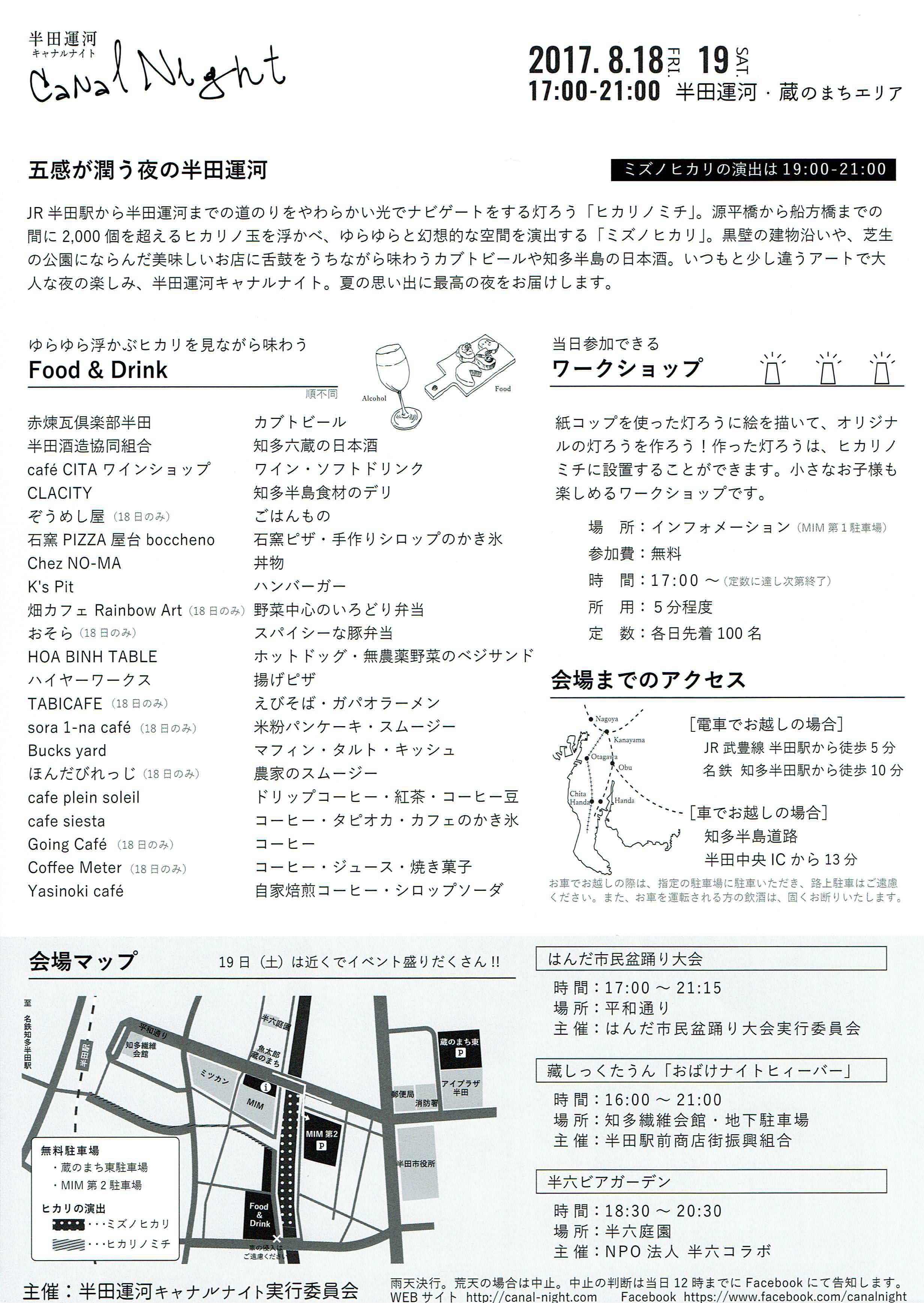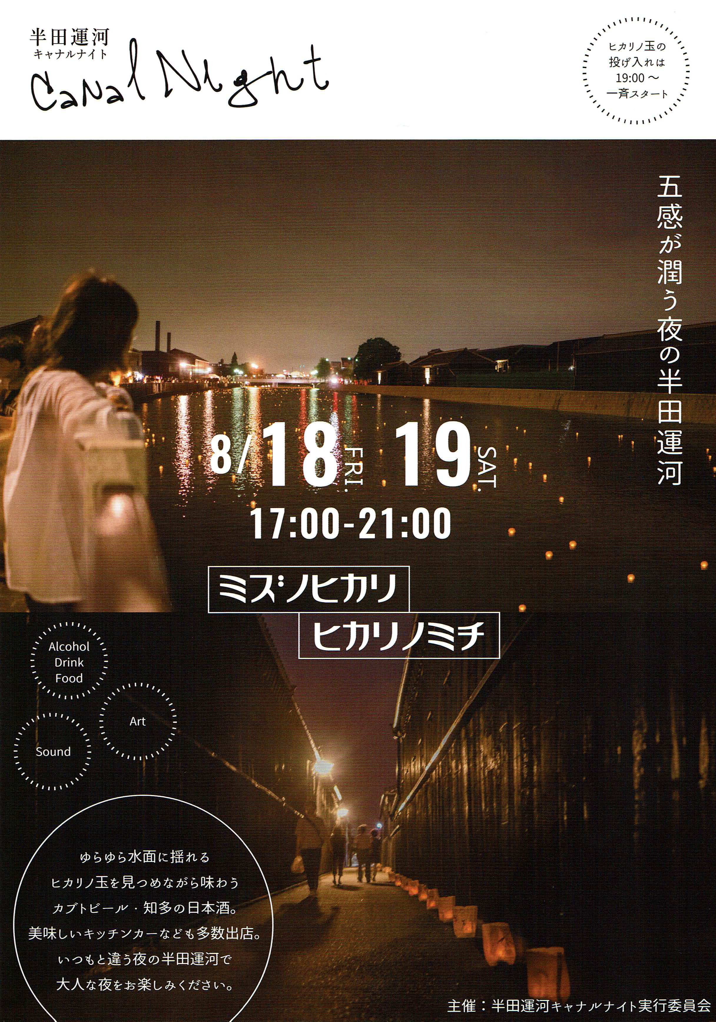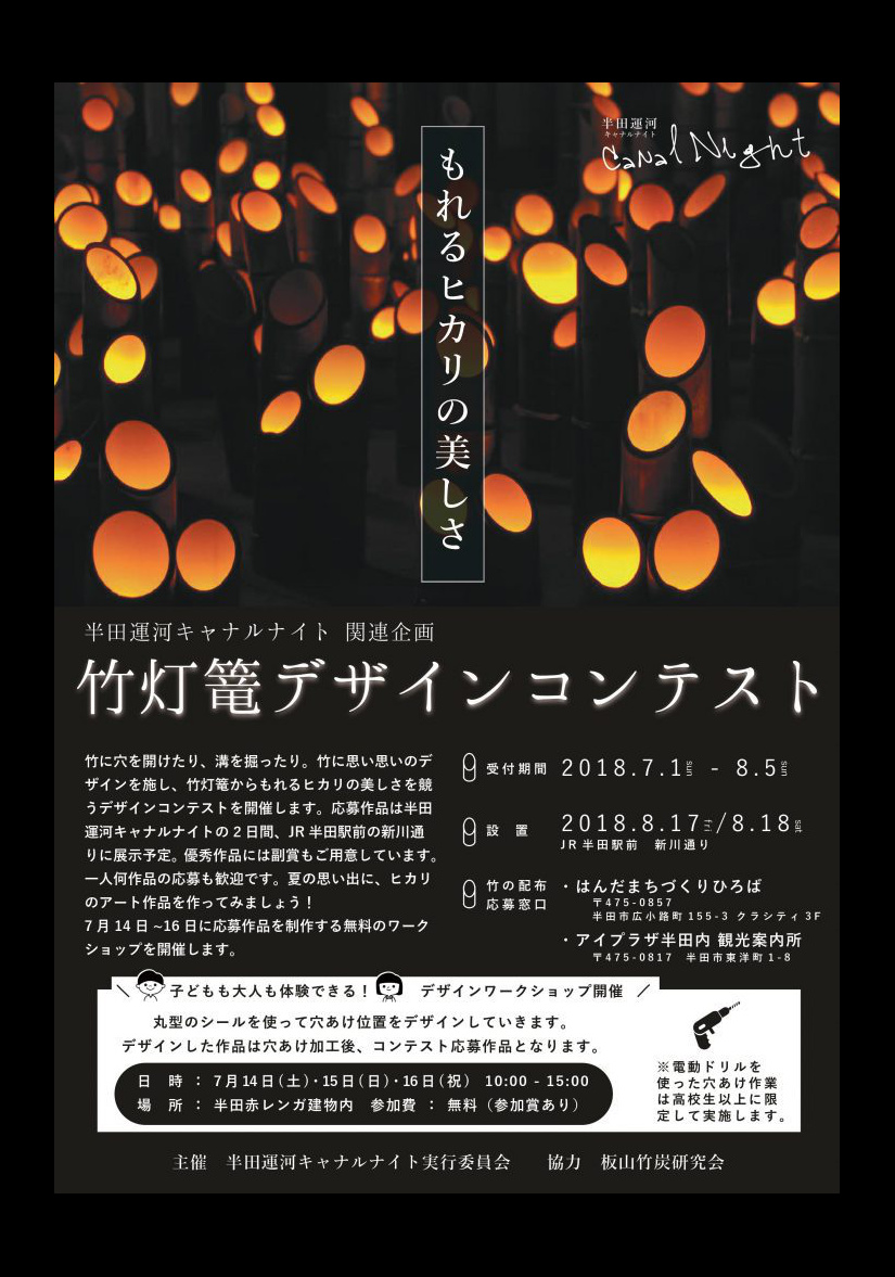 展示期間2018年8月17日(金)・18日(土) 17:00 – 21:00展示場所JR半田駅前新川通り賞ミツカン賞1名…純酒粕酢「千夜」「三ツ判山吹」セットクラシティ賞3名…クラフトビアテラス 3,000円分チケットうな東賞10名…うな東 1,000円分お食事券半田駅前商店街賞10名…QUOカード 500円分※応募者全員に参加賞のプレゼントあり審査員半田運河キャナルナイト実行委員会審査発表8月10日前後を予定